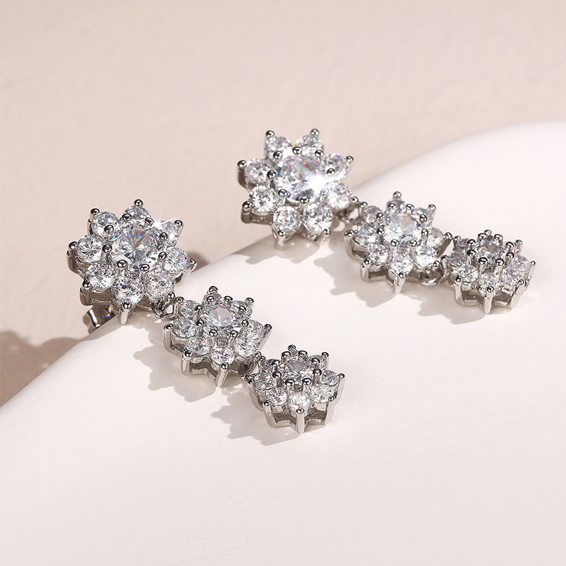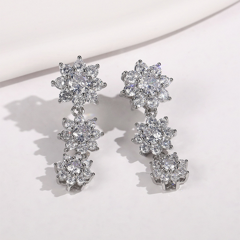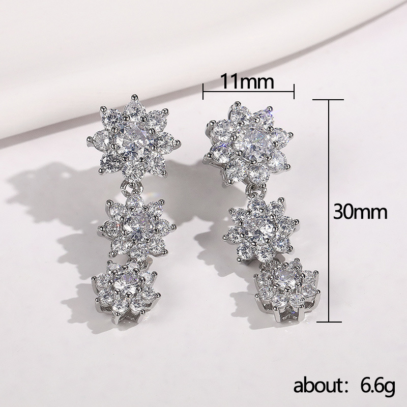 New European and American earrings, light luxury floral diamond-studded zircon earrings for women, simple white gold earrings